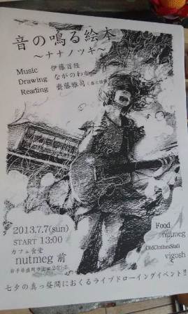 7月7日13:00から、上田通りにあるnutmegさんというカフェ食堂にて、ライブドローイングのイベントがあります。