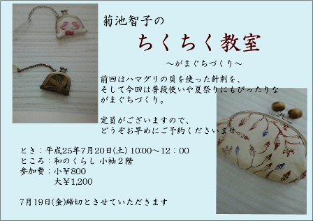 7月20日(土)10:00~の【菊池智子のちくちく教室】、まだすこ~しだけご予約をお受けできます!!