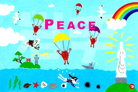 地色も三陸の海・空を連想させる爽やかなブルーに、ウミネコや大槌町の蓬莱島、釜石大観音などのモチーフをあしらって。