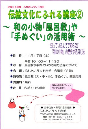 ふれあいランド岩手さんの会場で、風呂敷や手ぬぐいの活用法についてをレクチャーします! わかりやすく楽しいトークで評判の裕美子店長の講座。参加費が無料なんて、こんなおトクな講座を逃すのは勿体ない!!