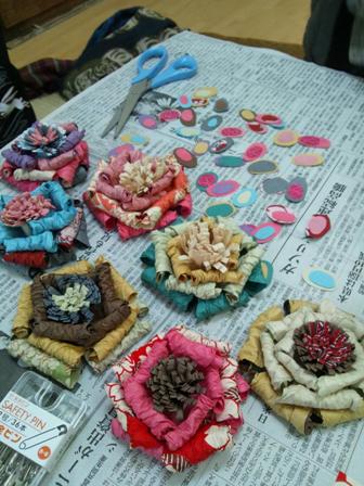 実は今回のワークショップでは、お作りいただいたコサージュ1個はお持ち帰りいただき、余力とお時間のある方には、何個も作っていただいております。