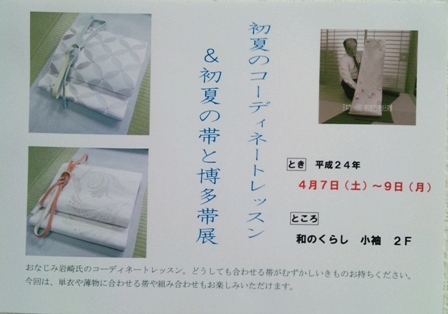 さて、そんな肌寒い4月ではありますが今週末は「初夏のお着物 コーディネイトレッスン」を開催します。