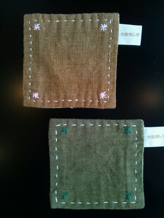 「大槌復興刺し子プロジェクト」コースターは各種1枚 700円、ふきんは1,200円となっております。