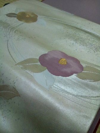 帯は引き箔の椿柄。