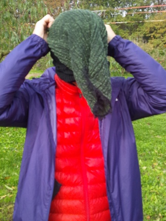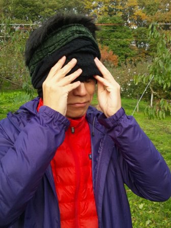 ②続いて、帽子をほどいて筒状にしたキャップを、ぐっと被って…
