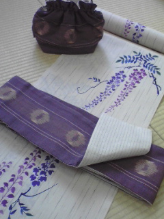 浴衣にも、紬にも合いそうな、綿の絣帯・バッグです。