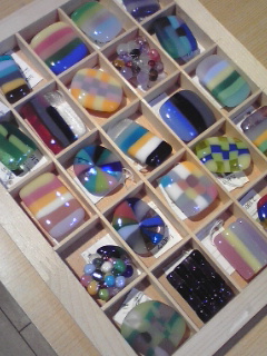 ●花想容さん:展示用・販売用の書籍、ガラスの帯留め(中野さんの出来たてほやほや商品もあり)