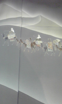 砂漠を歩く、ラクダに乗った商人たちも、背景のグラデーションが美しい!