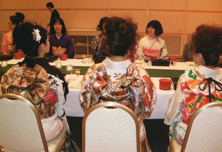 振袖の着付けは、体力と技術が要ります!Nさん、技術もピカイチでして、帯の結び方もレパートリーの多いこと!!「バラ」や「あさがお」などの花結びも多く、みなさま一人一人に、違う結び方をして差し上げていましたよ。天晴れ!!