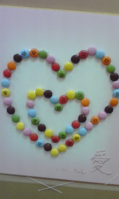 ハート型にチョコを並べて…さらに2重にして、愛があふれるように!願いを込めました。右下に書いた「愛」の文字は、ピンクのチョコペンで。どこまでも“チョコレート”にこだわって。