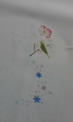 もう片側には、赤い椿と鶯、小花。お色がたくさん入っているのにまとまりがあるのは、色の調合にも気を遣っているから。この辺は、先生の腕!