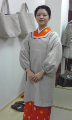 通常、真白いお母さんかっぽう着しかないんですよね。そこで、西條さんに、シンプルで、ちょっと大人っぽいかっぽう着を注文したという訳で…