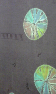 中野さんの作品は、とにかくユニーク!先に水玉のようにカラフルに色を注しておいて、そこに絞り染めをしてみたり、織物の上からさらに絞り染めをしてみたり…