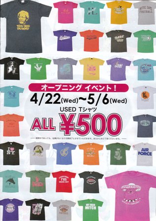 なんと6日(水・祝)まではオープニング・イベントでTシャツ・オール¥500ですって!おトク!