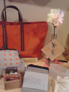 大きく口が開く「がま口ポーチ」や緑茶が入った麻のお茶筒、ちょっとしたお出かけに丁度良いミニ・トートバッグ…などなど。