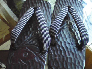 右と左にまたがって、鯉が描かれています。鼻緒は縦縞。粋ですねーー。