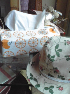 後ろに写っているのは、手拭いの使い方で紹介した「BOXティッシュ包み」。こんな風に手ぬぐいで包むだけで、お部屋のインテリアになります!すぐにお洗濯できるし、気分によって柄を変えられるので手軽でオススメ!ぜひ、お試しを。