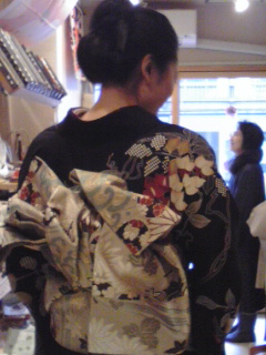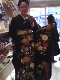 ビューティホー!!黒地に大胆な菊や藤の花が描かれた振袖をお召しになっていました。今日は香道の初稽古だったそうです。ヤマトナデシコですねぇ♪