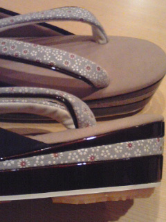 鼻緒とサイドの切り替えが、印伝をあしらったデザインになっています。全体の素材はスエード。温かみがあって、はんなりとた雰囲気です。