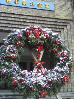 公会堂前の大きなリースも、ちょっと雪化粧。