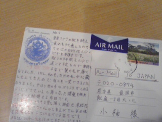 今日、手紙をくれた主は、小袖に郵便配達してくださっていた学生さん。農業の勉強をしながら、1年くらいアジアを放浪するですって。
