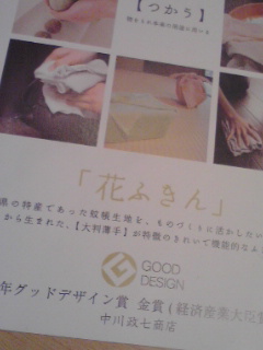 そんな「花ふきん」、実はこの度2008年のグッド・デザイン賞も受賞しましたー!しかも、1,000以上の受賞作品のなかでもTOP15に贈られる「金賞」を受賞したとのこと。「さくら」や「菜の花」といった花にちなんだやさしい色合いも魅力の「花ふきん」ですが、見た目と実用性の両面から評価されての受賞なのでしょう!!