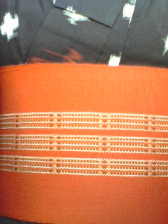私は、お客様からお借りした絣のきものに初めて袖を通しました。綿の単衣、とても軽いです。黒地に赤と白の絣模様が映えて…昔っぽいけど、今着ても違和感がありません。何だか、着ていて嬉しいです♪ 赤い帯は、中村工房さんのホームスパン。上等~!!手触りも良くて、あったかいです!