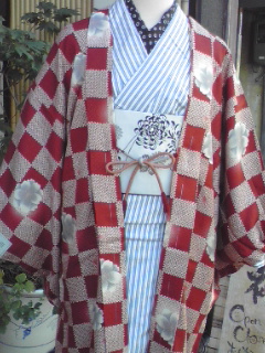 小袖ちゃん、この秋のポイントは羽織。もうだいぶ寒くなってきたので、着て歩いても大丈夫ですよ!むしろ、1枚羽織っておくと、とてもあたたかい♪ 今回のは、お仕立て上がりで¥39,800というお値打ち品。もちろん、正絹で裏地はピエロ。表地は、深みのある赤の市松に花が描かれています。羽織紐も付いているんですよー!お得でしょ♪ 柄違いも、あります!